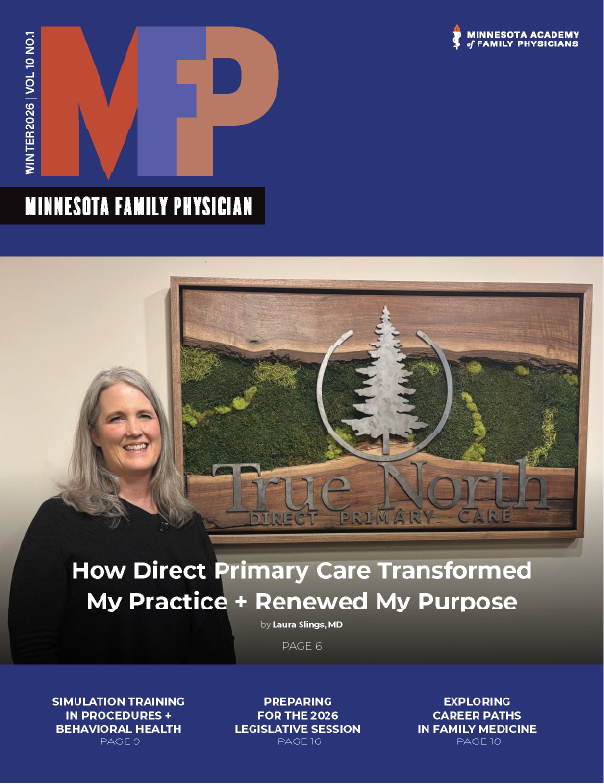 The Minnesota Family Physician (MFP) magazine highlights the voices and work of MAFP members while covering timely topics that matter to family medicine and primary care in Minnesota—from clinical insights and advocacy updates to leadership, research and more.